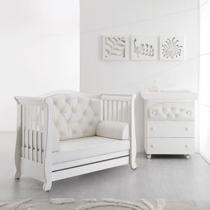 Das Babybett Soft vereint luxuriöses Design mit höchstem Komfort und praktischer Funktionalität. Es ist mit echten Swarovski® Elements veredelt, die an der gepolsterten Rückseite funkeln und dem Bett eine besonders elegante Ausstrahlung verleihen. So wird das Babybett zum stilvollen Mittelpunkt jedes Kinderzimmers.